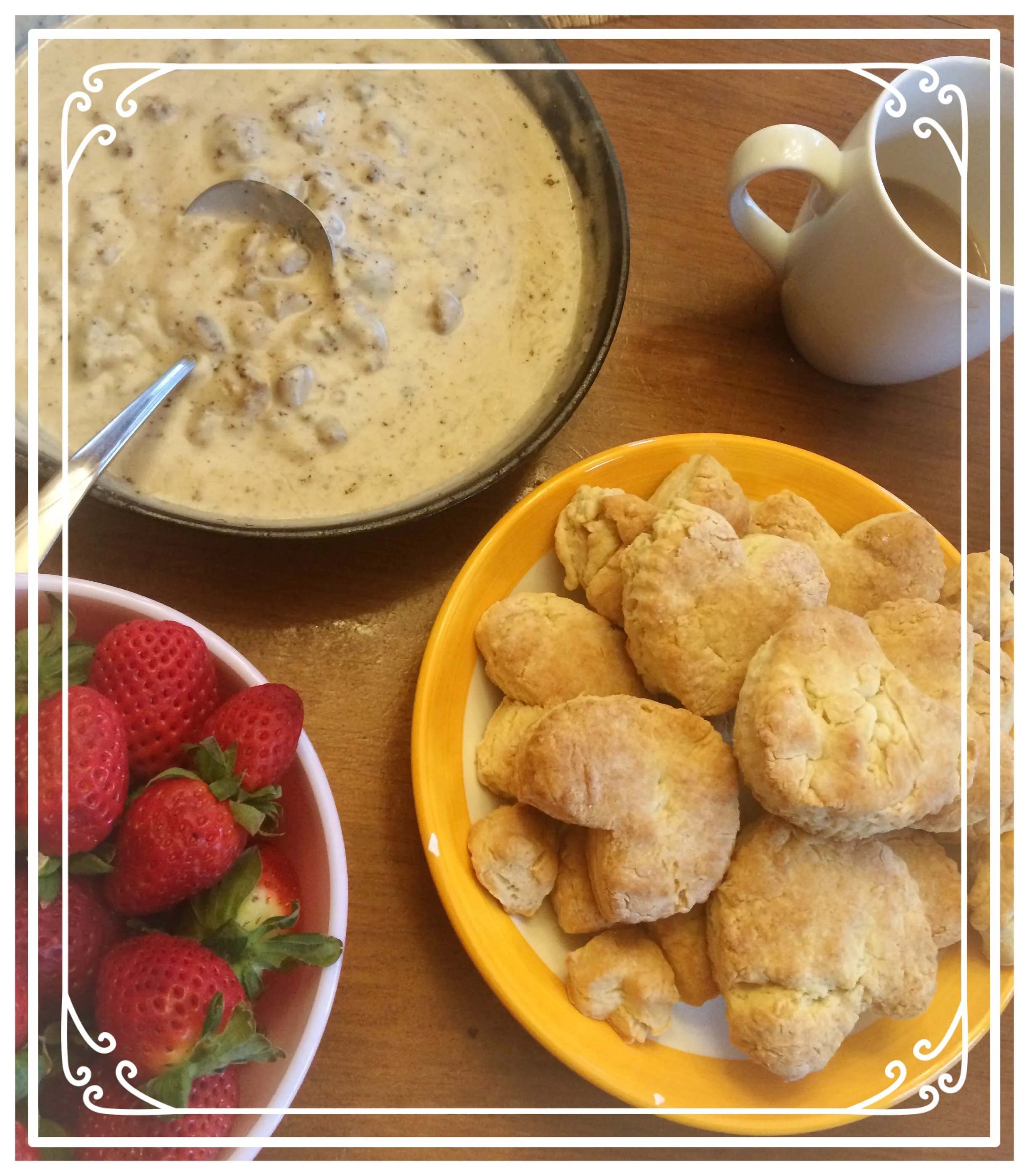 Nothing in my family says LOVE like biscuits and gravy! Eating them transports me back to my grandma's breakfast table, or to her sisters, my grand "Aint Eunice" who often made cocoa gravy instead of sausage, to drench them in.